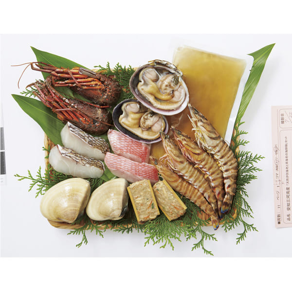 内容・容量 : 天然伊勢海老〈半身2切〉120g、天然車海老40g×4、天然大はまぐり150g×2、天然大あさり〈片貝〉100g×2、天然真鯛〈切身〉35~40g×2、天然金目鯛〈切身〉35~40g×2、つみれ〈竹筒入〉50g、海鮮鍋つゆ〈希釈用〉