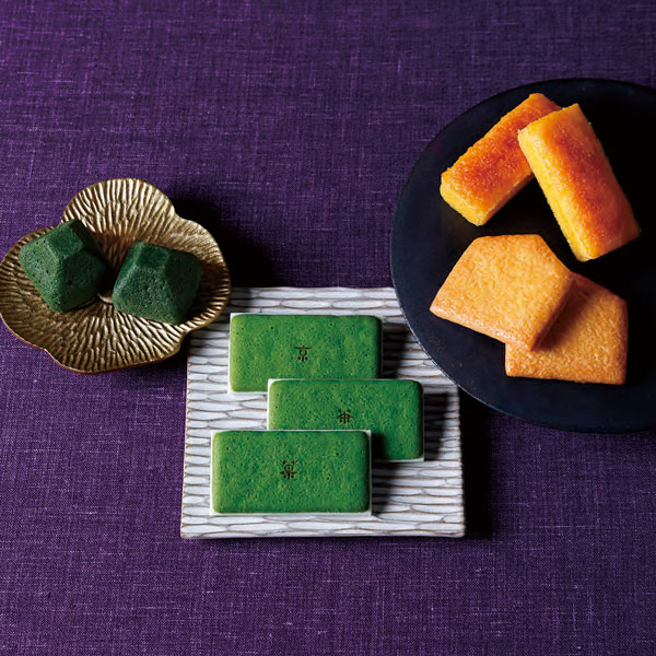 京都 宇治のお濃茶を使用した「茶の菓」「生茶の菓」と上質で香り豊かなバターを使用した「シェフクッキー」と「バターカステラ」の詰合せ。
