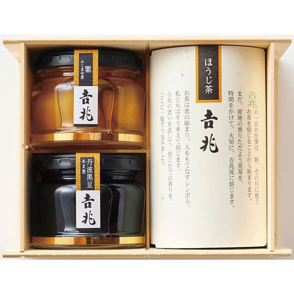 内容・容量 : 丹波黒豆あま煮 70g、栗ふくませ煮 60g、ほうじ茶(25g:5g×5)