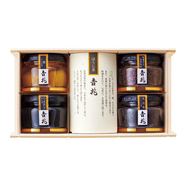 内容・容量 : 椎茸うま煮・丹波黒豆あま煮 各70g×1、栗ふくませ煮 60g、なま干しさざなみ 50g、ほうじ茶(25g:5g×5)