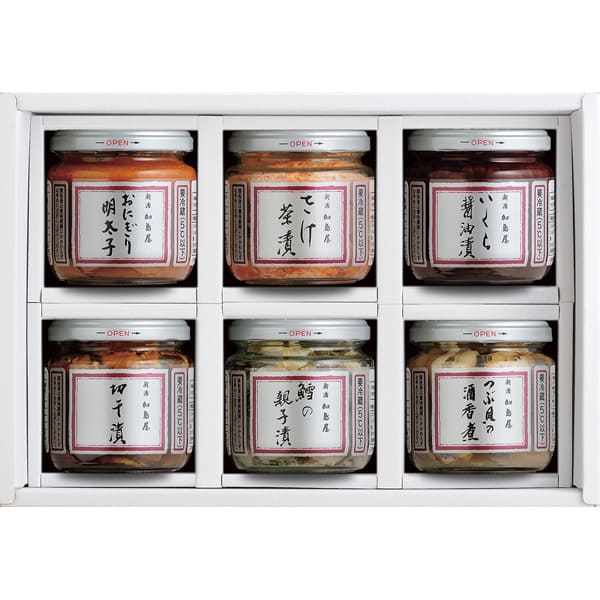 内容・容量 : さけ茶漬130g、いくら醤油漬・鱈の親子漬各160g、切干漬・おにぎり明太子各170g、つぶ貝の酒香煮170g(固形量90g)