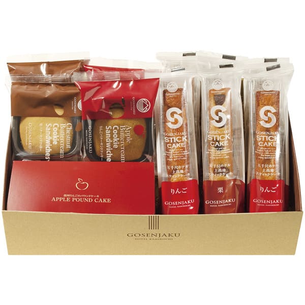 内容・容量 : スティックケーキ2種(りんご・栗)×各3、バターサンド2種(りんご・栗)×各2、りんごパウンドハーフ×1