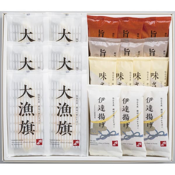 大判肉厚な看板商品の笹かまぼこ「大漁旗」や、仙台味噌の風味が広がる揚げかまぼこ「伊達揚げ」など、人気の商品を詰合せた特選ギフトです。