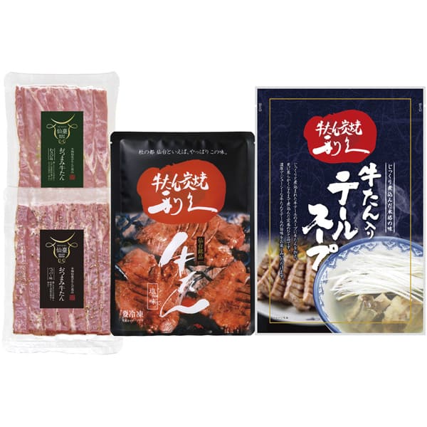 内容・容量 : 牛たん真空パック塩味100g×1、テールスープ250g×1、おつまみ牛たん(ペッパー味・わさび味)50g×各1