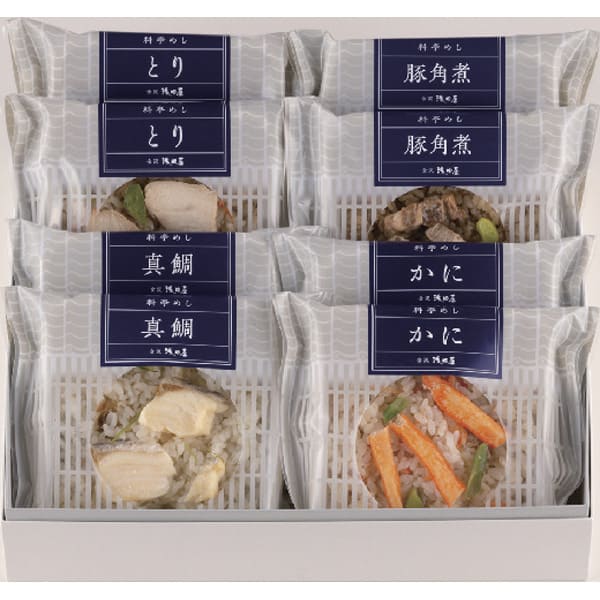 内容・容量 : かにめし、真鯛めし、豚角煮めし、とりめし各120g×2