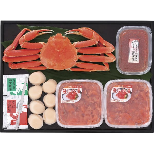 内容・容量 : ボイルずわいがに姿1尾400g・鮭ルイベ漬160g×2、帆立貝柱150g、魚醤入いくら醤油漬80g、かにしおりセット(かに用付けタレ 三杯酢34g、ゆず風味たれ34g、かにスプーン、かに栞、カニの殻入れ付き)