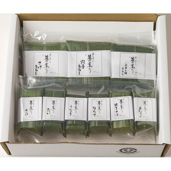 内容・容量 : 笹巻蒸しちらし寿司(焼き鮭、山菜と鶏、あなご)×各1、笹巻き寿司(あなご、さけ、ほたて、たい、焼さば、うなぎ)×各1