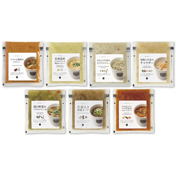 内容・容量 : トマトと鶏肉のシチュー・北海道産とうもろこしと鶏肉のシチュー・きのこと牛蒡のホワイトシチュー・塩糀と生姜のチャウダー・緑の野菜のミネストローネ・生姜入り和風スープ・とうもろこしとパプリカのチリビーンズスープ 各180g×1 計7種7パック