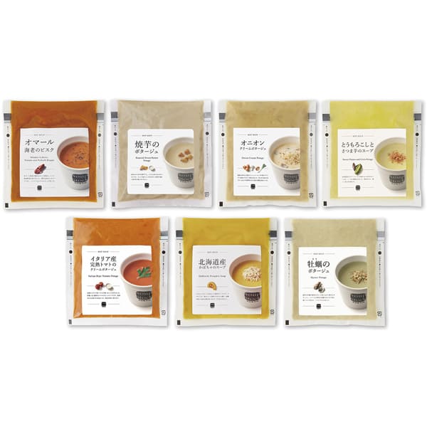 内容・容量 : オマール海老のビスク・焼芋のポタージュ・とうもろこしとさつま芋のスープ・オニオンクリームポタージュ・北海道産かぼちゃのスープ・イタリア産完熟トマトのクリームポタージュ・牡蠣のポタージュ 各180×1 計7種7パック