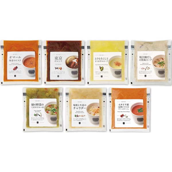 内容・容量 : オマール海老のビスク・東京ボルシチ・とうもろこしとさつま芋のスープ・焼き鯛だしの和風スープ・緑の野菜のミネストローネ・イタリア産完熟トマトのクリームポタージュ・塩糀と生姜のチャウダー 各180g×1 計7種7パック