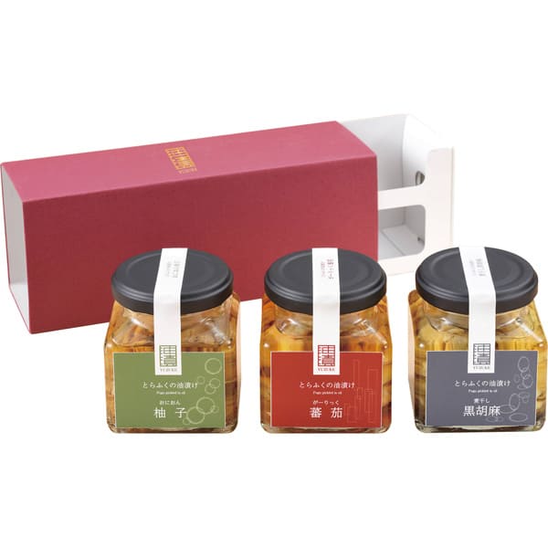 内容・容量 : とらふぐの油漬け(がーりっく蕃茄)85g、とらふぐの油漬け(煮干し黒胡麻)85g、とらふぐの油漬け(おにおん柚子)85g