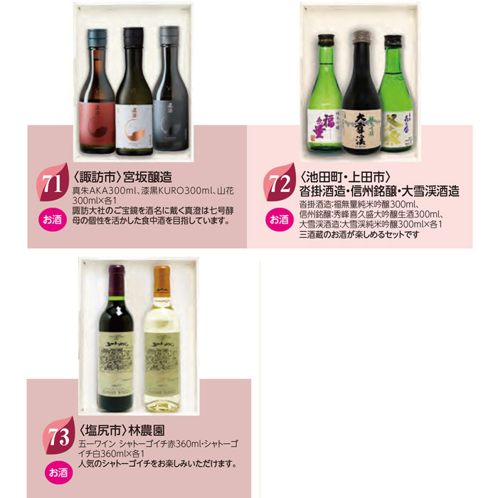 沓掛酒造:福無量純米吟醸300ml、信州銘醸:秀峰喜久盛大吟醸生酒300ml、大雪渓酒造:大雪渓純米吟醸300ml×各1