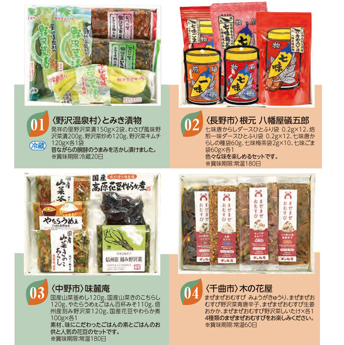 国産山菜釜めし120g、国産山菜きのこちらし120g、やたらうめぇごはん百杯みそ110g、信州産刻み野沢菜120g、国産花豆やわらか煮100g×各1