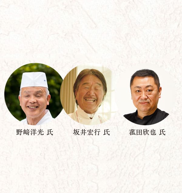 料理界において、「巨匠」と呼ぶにふさわしい三人の料理人の確かな技と感性が織りなす美味の饗宴をお楽しみください。
