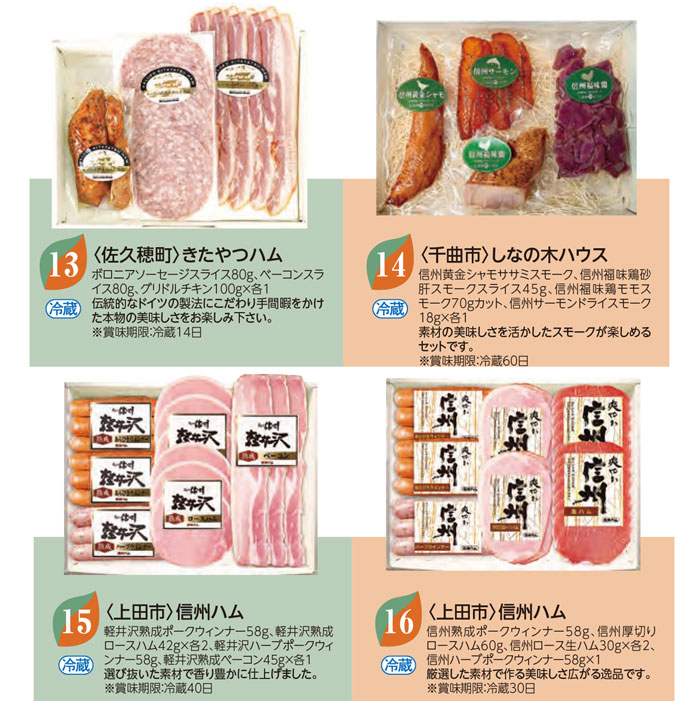 信州熟成ポークウィンナー58g、信州厚切りロースハム60g、信州ロース生ハム30g×各2、信州ハーブポークウィンナー58g×1