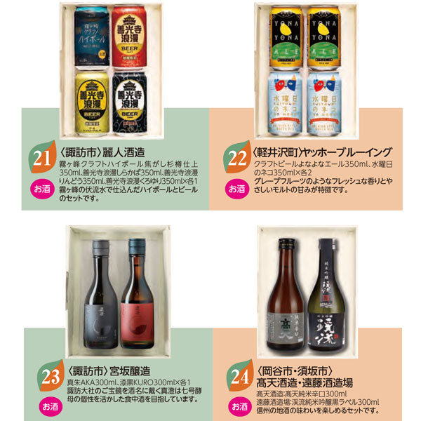 霧ヶ峰クラフトハイボール焦がし杉 樽 仕上350ml、善光寺浪漫しらかば350ml、善光寺浪漫りんどう350ml、善光寺浪漫くろゆり350ml×各1