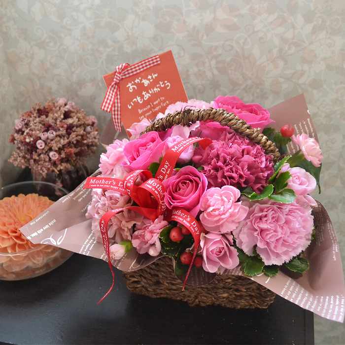 取っ手付きのバスケットにリボンが付いたアレンジメント。ピンクの濃淡で大人の雰囲気。