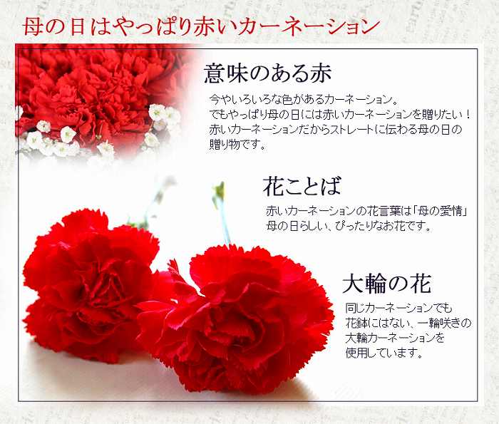 母の日にはやっぱり赤!という方も多い定番の赤いカーネーション。その鮮やかな赤を際立たせるかすみ草をぐるりと丸くあしらいグリーンをプラスしました。
