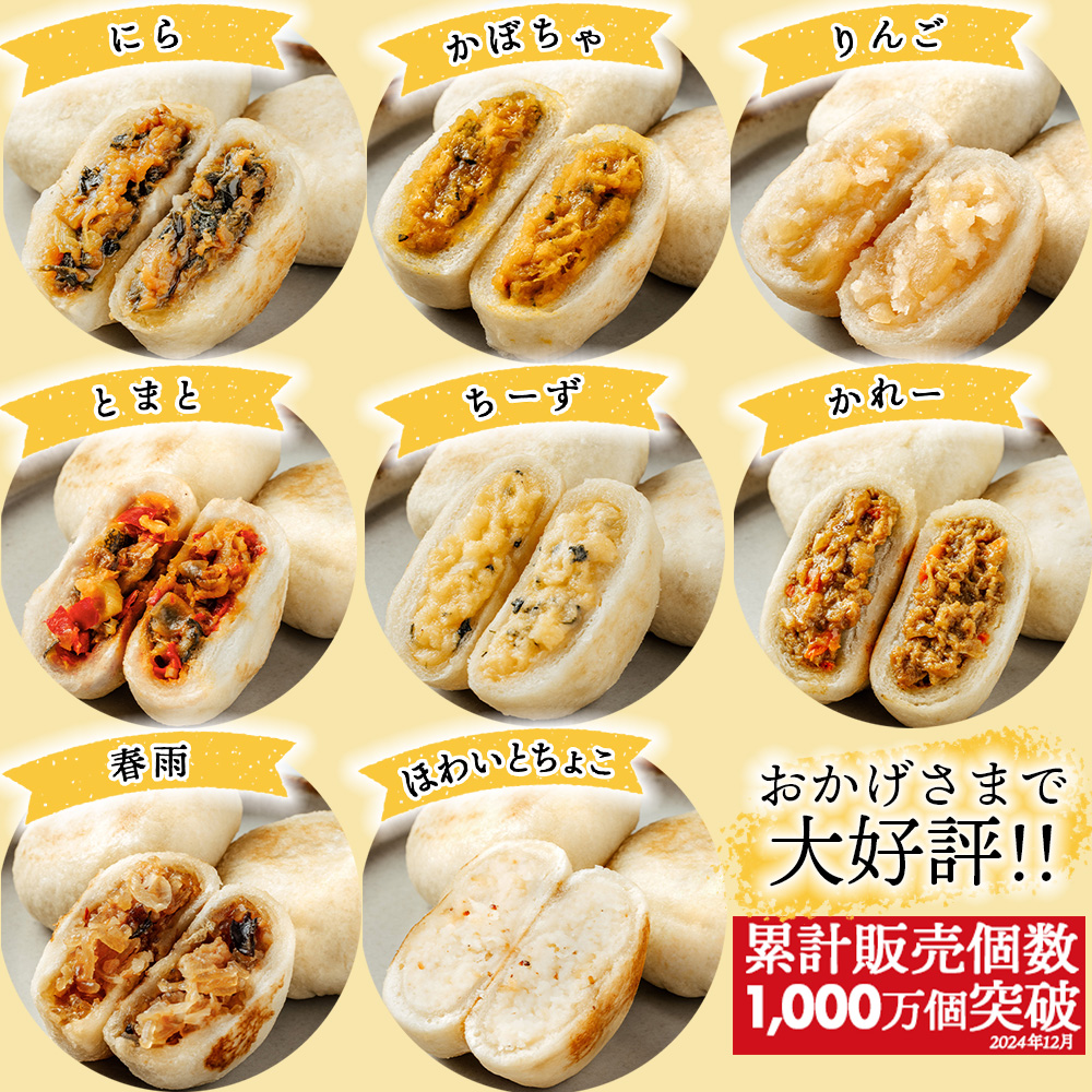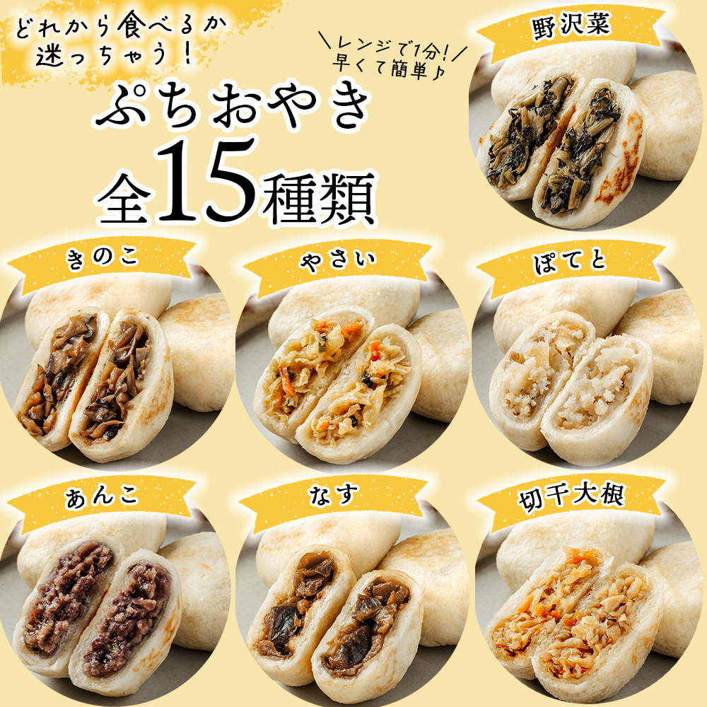 おやきの半分サイズは見た目も可愛く、贈り物にもぴったりです。定番の9種類の具材(国産無添加)に、ぷちおやき限定の6食を加えた15種類の味が楽しめます。某大手ECモールで食品総合ランキング1位の実績もあり!